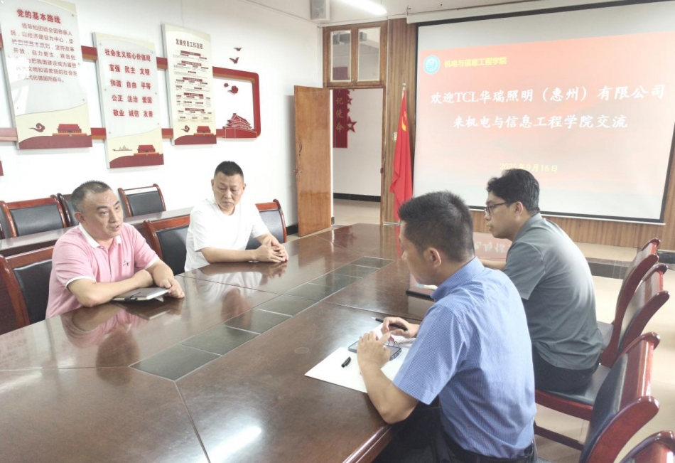 9月16日,应学院邀请,TCL华瑞照明(惠州)有限公司副总经理余志一行二人莅临机电与信息工程学院访问交流,共商校企合作事宜。学院党总支副书记贾庆辉、就业专员谭先友予以热情接待并参与座谈。