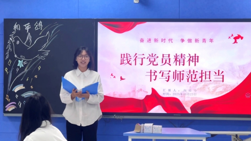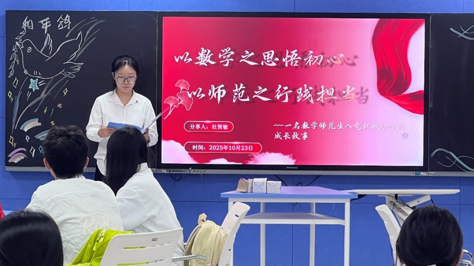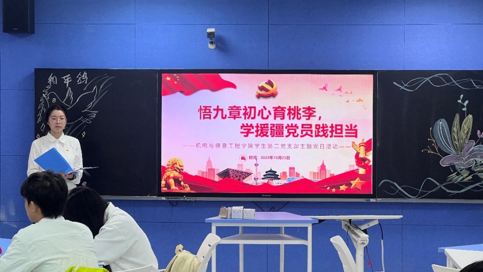 2025年10月23日,机电与信息工程学院学生第二党支部在3307教室成功举办了以“悟九章初心育桃李·学援疆榜样践担当”为主题的党日活动。本次活动旨在深入学习贯彻党的相关精神,强化党员的政治功能和组织功能,同时结合数学师范生的专业特质,弘扬“铸魂育人、先锋赋能”的使命。本次活动由陈红同学主持,支部全体党员和积极分子同学参加。