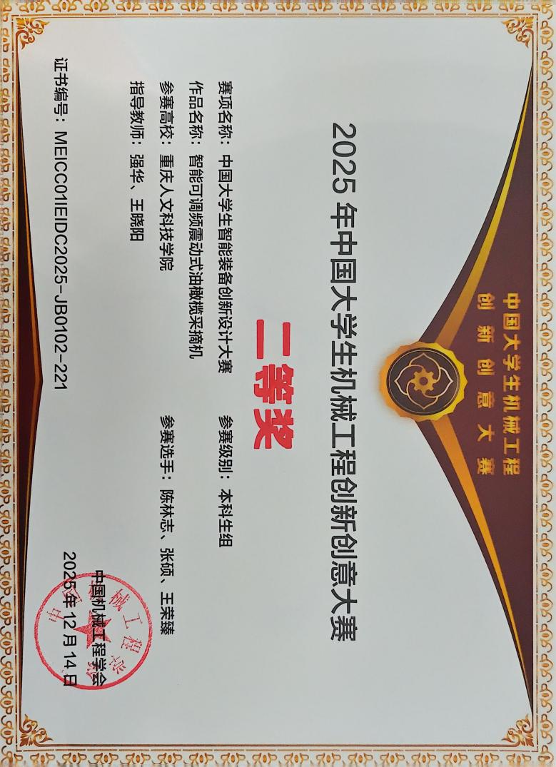2025 年 12 月 13 日至 14 日,中国机械工程学会主办的 2025 年中国大学生机械创新创意大赛(中国大学生智能装备创新设计大赛)全国总决赛在天津大学落幕。作为国家级赛事,大赛经多轮严苛遴选,944 个项目入围区域预选赛,428 个作品获全国总决赛推荐资格,275 个顶尖项目晋级现场决赛。我校组织 8 支队伍参赛,3 支挺进全国总决赛,与全国高校精英同台竞技,尽显重人科风采。