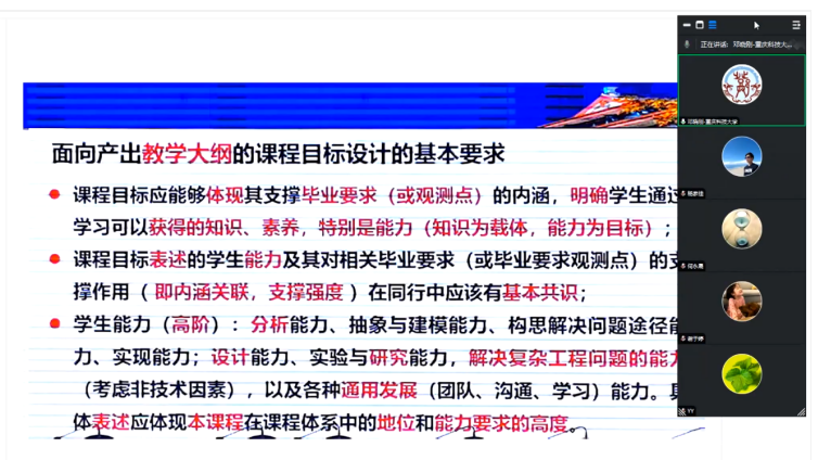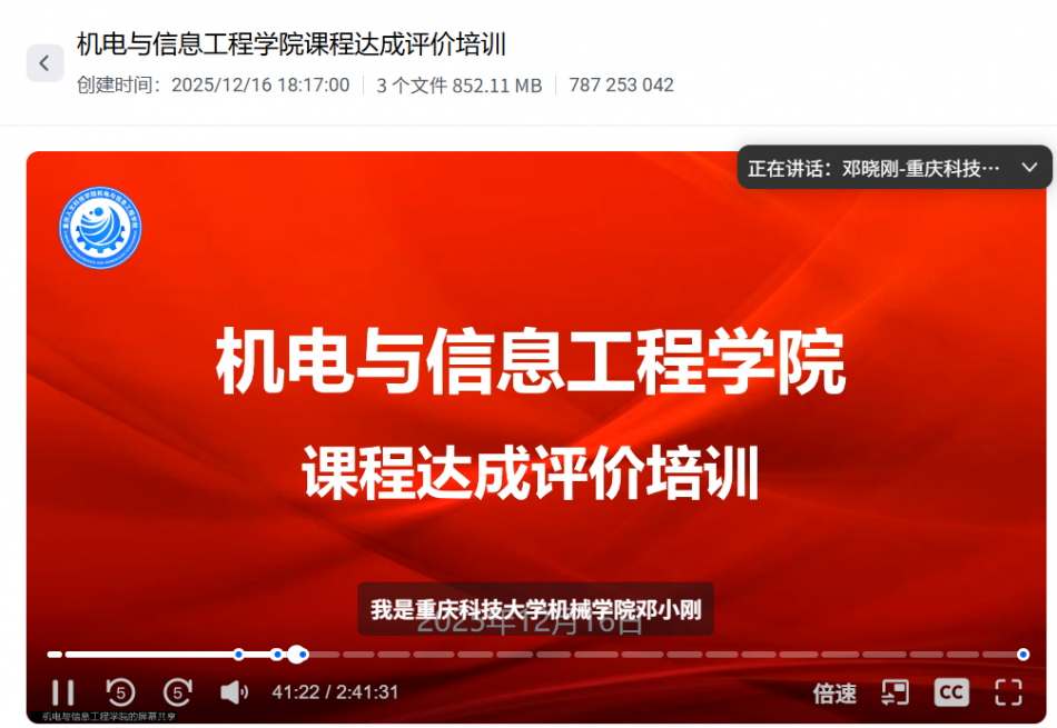 为深入推进工程教育专业认证与教学改革,提升教师基于OBE理念的课程建设与评价能力,学院于2025年12月16日晚举办课程目标达成评价专题线上培训。本次培训特邀重庆科技大学机械与智能制造学院副院长、博士生导师邓晓刚教授担任主讲,各系主任、教研室主任及2025级全体任课教师参加,活动由邓凌云主持。