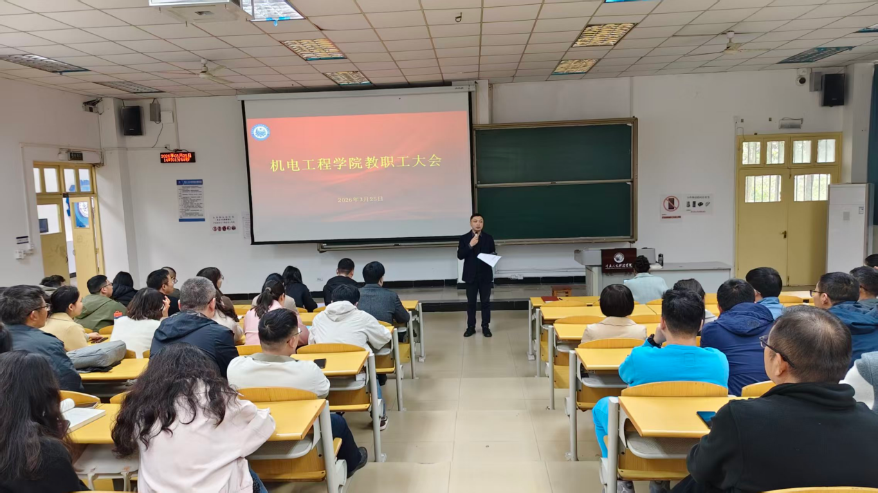 2026年3月25日下午,机电工程学院在3102教室召开全体教职工大会。学院党总支书记朱宇、院长强华、副院长李正网、副院长邓凌云出席会议,全体教职工参加。会议由党总支书记朱宇主持。