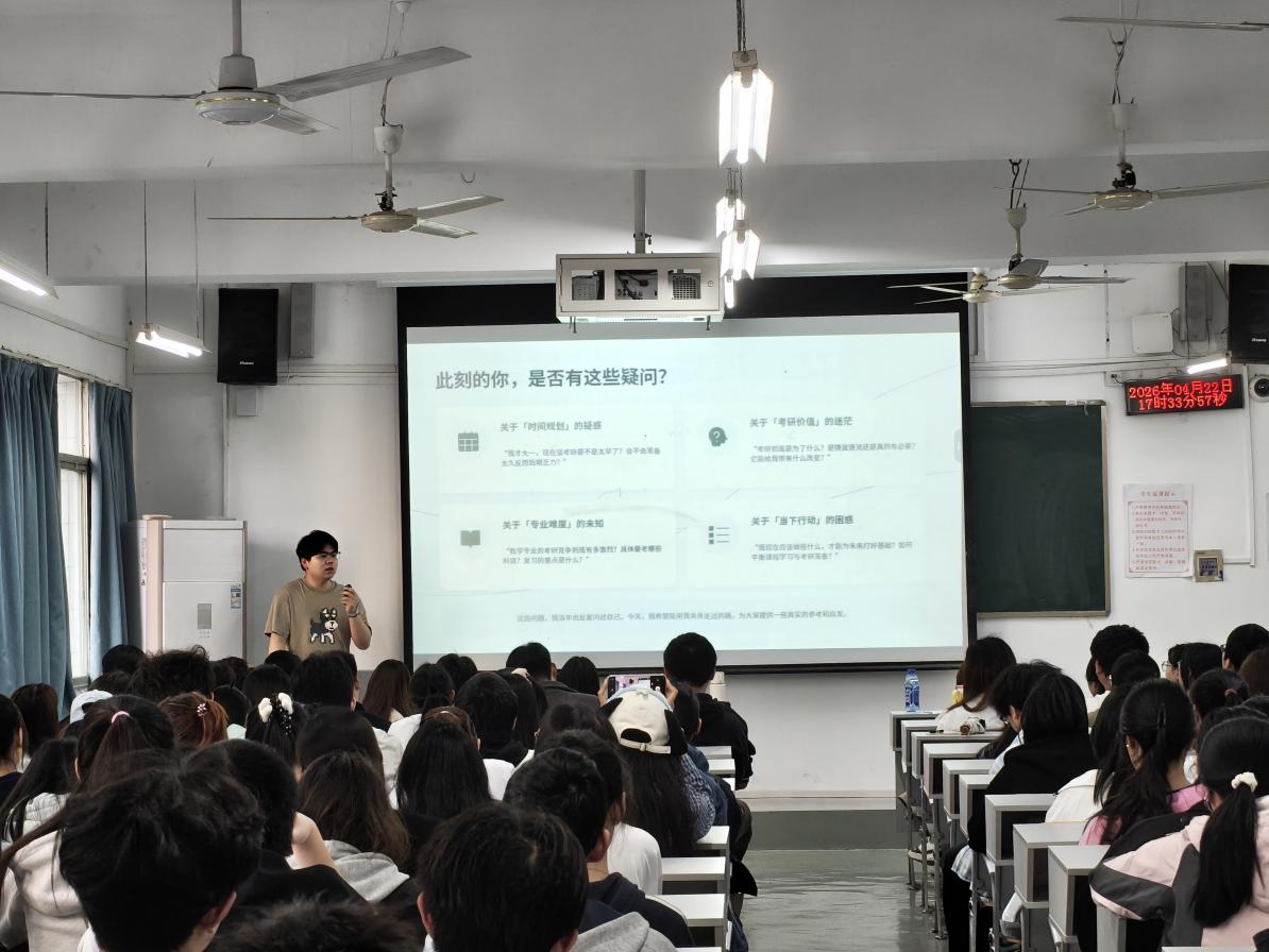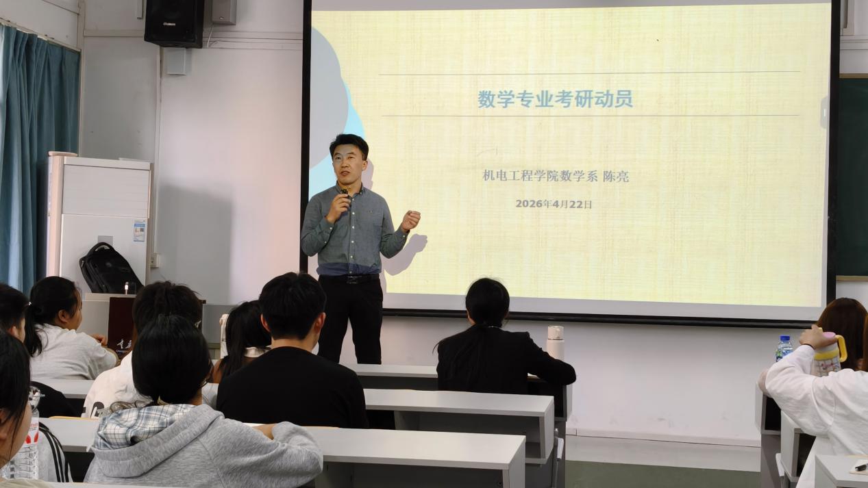 为帮助数学与应用数学专业学子明晰考研方向、掌握备考策略、切实解决备考过程中的困惑,2026年4月22日下午,机电工程学院在博文楼1405成功举办数学与应用数学专业考研宣讲会。本次活动特邀2026届考研上岸的庞霆(陕西科技大学)、张莎莎(重庆工商大学)两位优秀学姐学长分享实战经验。学院数学专业教师冯小祝、杨俸、陈亮及辅导员陈秀玲到场参与,为百余位有考研意向的学子提供有针对性的备考指导,本次活动由陈秀玲老师主持。
